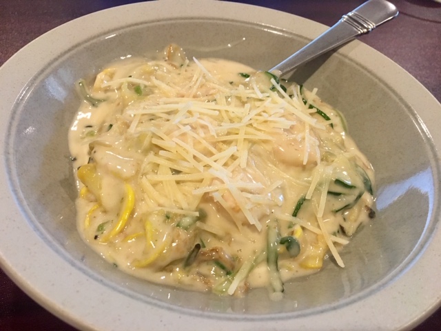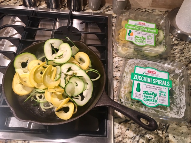 Start with some olive oil and veggies. I bought these zucchini noodles and spiraled squash already washed, cut and ready to go at my local grocery store. Sautee the veggies until tender. Salt and pepper to taste.