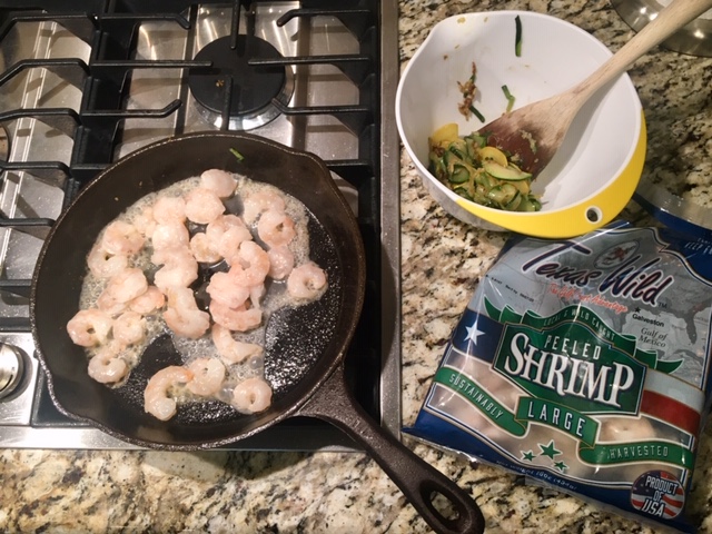 Remove the veggies from the pan and throw in some shrimp. I got these shrimp in the frozen seafood section. I ran them under cold water in a colander while my veggies were cooking to thaw them out. You might need a little more olive oil or butter in your pan. Cook the shrimp until they are nice and pink