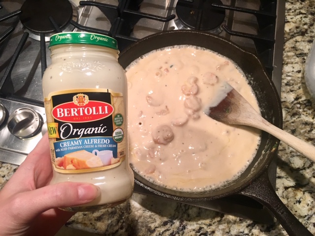 Next, pour in some Alfredo sauce. Once again, I did not make mine from Scratch. I used Bertolli Organic Creamy Alfredo sauce. Bring to a boil and then simmer to 3-5 minutes.