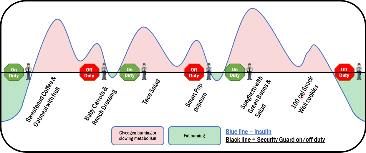 The problem is insulin. Insulin is like a security guard outside the bank that won’t let anyone come in to do their transactions. When Mr. Insulin Security Guard is there, we can’t go do our withdraw from the savings account. Meaning, our body can’t access the fuel it has stored in our fat cells.